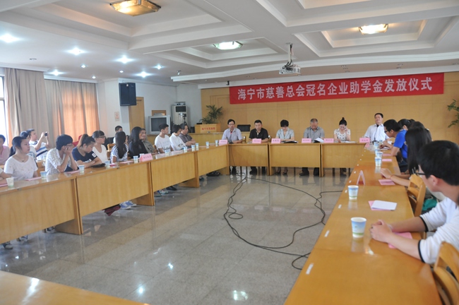 海宁市2014年度贫困大学生慈善助学发放仪式在市民政局礼堂举行。市慈善总会副会长兼秘书长吴永华主持了活动。助学冠名企业海宁皮革城、钱江生化股份有限公司、鸿翔控股集团、锦达股份有限公司参加了发放仪式。两位分别来自郑州大学、浙江师范大学的海宁籍优秀贫困大学生作了自强不息、励志学习、回报社会的发言。受集团董事长姚岳良委托,党委书记徐明华参加了发放仪式并代表多家冠名企业作了发言。海宁市人民政府副市长朱海英出席发放仪式并作重要讲话。