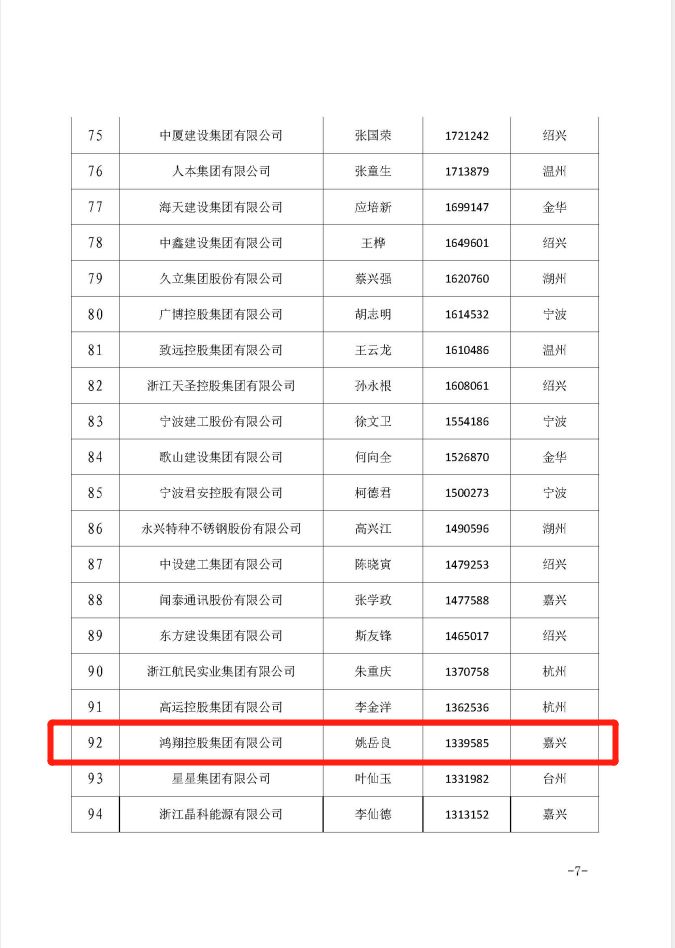 8月5日,浙江省市场监督管理局、浙江省工商业联合会、浙江省民营企业发展联合会根据2018年度企业年报相关数据,以企业年度营业收入为基本标准,参考企业净资产、纳税额、净利润等指标,联合公布了“2019浙江省民营企业100强”,鸿翔控股集团有限公司位列第92位。
